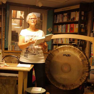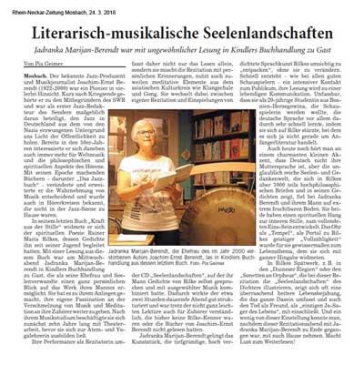 In seinem letzten Buch „Kraft aus der Stille“ widmete er sich der spirituellen Poesie Rainer Maria Rilkes, dessen Gedichte ihn seit seiner Jugend begeleitet hatten. Mit einer Lesung aus diesem Buch war am Mittwochabend Jadranka Marijan-Berendt in Kindlers Buchhandlung zu Gast, die als seine Ehefrau und Seelenverwandte einen ganz persönlichen Blick auf das Werk ihres Mannes ermöglicht. Sie hat es zu ihrem Anliegen gemacht, ihre eigene Faszination an der Verschmelzung von Musik und Meditation an ihre Zuhörer weiter zu geben. Nach ihrem Musikstudium beschäftigte sie sich zunächst 10 Jahre lang mit Theaterarbeit, bevor sie sich zur Atem- und Yogalehrerin ausbilden ließ. Ihre Performance als Rezitatorin umfasst daher nicht nur das Lesen allein, sondern sie mischt die Rezitation mit persönlichen Erinnerungen, nutzt auch zuweilen meditative Elemente aus dem asiatischen Kulturkreis wie Klangschale und Gong. Sie wechselt dabei zwischen eigener Rezitation und Einspielungen von der CD „Seelenlandschaften“, auf der ihr Mann Gedichte von Rilke selbst gesprochen und mit ausgewählter Musik kombiniert hatte. Dadurch wirkte der etwa zwei Stunden dauernde Abend gut strukturiert und war trotz der nicht ganz leichten Lektüre auch für Zuhörer verständlich, die bisher keine Rilke-Kenner waren oder die Bücher von Joachim-Ernst Berendt gelesen hatten.